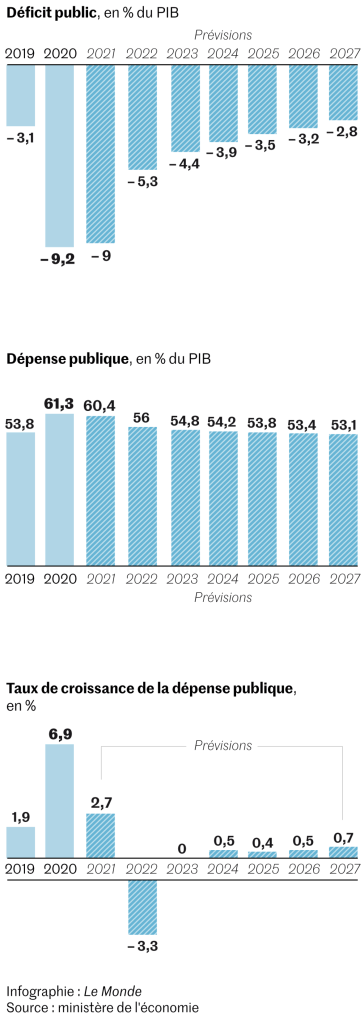 Dans le détail, alors que le déficit public a plongé en 2020, à 9,2 % du produit intérieur brut (PIB), et devrait encore atteindre 9 % cette année en raison du reconfinement, l’objectif affiché du programme de stabilité est de revenir sous les 3 % en 2027. C’est le niveau de déficit qui permettrait de stabiliser la dette en 2025 et de la faire baisser à partir de 2026, argue-t-on au ministère de l’économie.