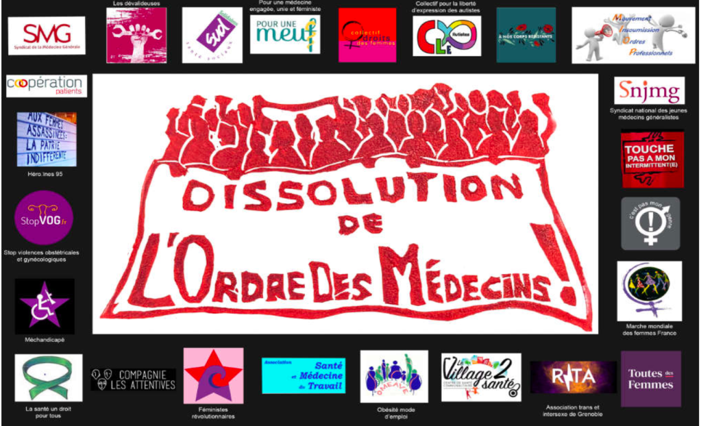 Syndicat de la Médecine Générale – Syndicat National des Jeunes Médecins Généralistes – Mouvement d’Insoumission aux Ordres Professionnels – Association Santé et Médecine du Travail – Pour Une Meuf – Méchandicapé – Stop Violences Obstétricales et Gynécologiques – Touche Pas à Mon Intermittente – Collectif National des Droits Des Femmes – Marche Mondiale des Femmes de France – Association La Santé Un Droit Pour Tous – Coopération Patients – Les Dévalideuses – CLE Autisme – Héro-ïnes 95 – Compagnie Les Attentives – A Nos Corps Résistants – Le Village 2 Santé- Sud Santé Sociaux – Toutes des Femmes – Féministes révolutionnaires – Association RITA – Obésité mode d’emploi – C’est pas mon genre.