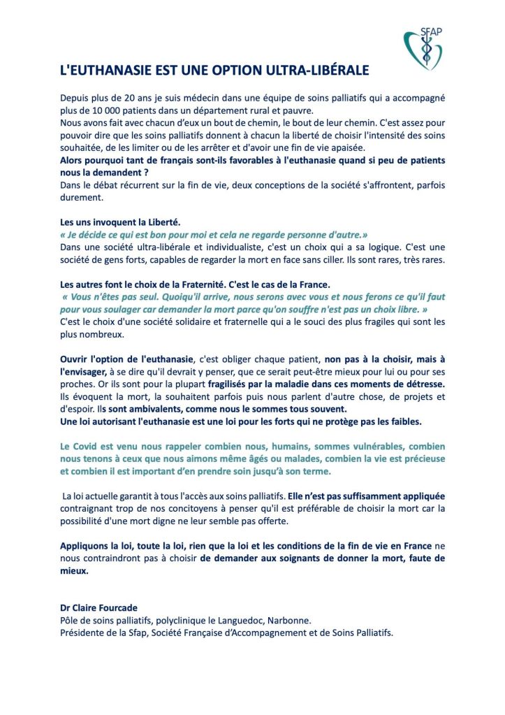 Pourquoi tant de Français sont-ils favorables à l’euthanasie quand si peu de pateints nous la demandent ? (Dr Claire Fourcade Présidente de la Société Française d’accompagnement et de soins palliatifs)