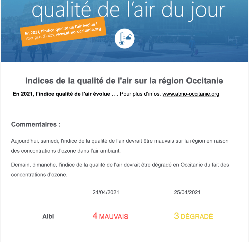 Au total, albi présente des épisodes de pollution assez nombreux, soit aux particules fines, soit à l’ozone, est près de la circulation urbaine ou proche de la rocade des taux de N02 dépassant l’objectif de qualité.