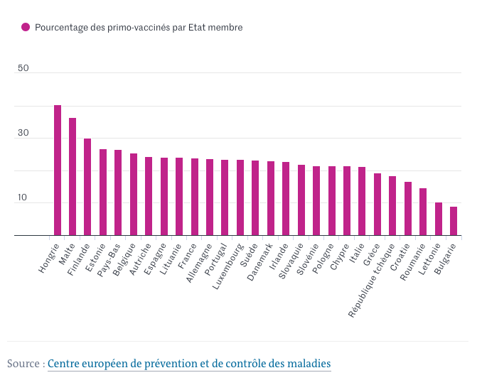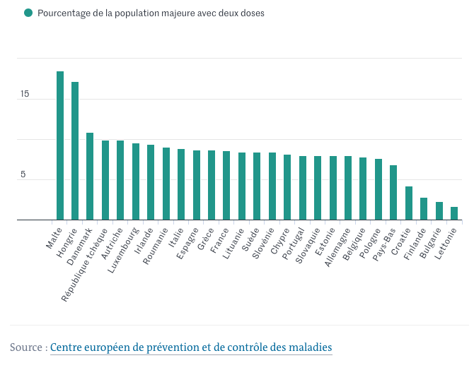 Selon l’ECDC, sur les 27 Etats membres de l’Union européenne (UE), la France se classe à la 10e place des pays ayant le plus administré de première dose, avec près de 24 % de la population adulte déjà primo-vaccinée. Un chiffre qui place, certes, la France en « première partie du tableau », mais loin du trio de tête occupé par la Hongrie (40 %), Malte (37 %) et la Finlande (30 %).