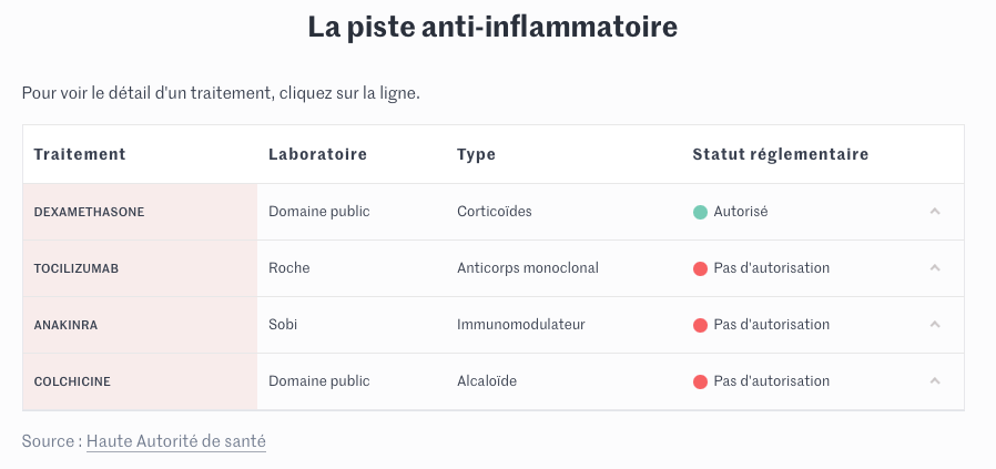 Ces tableaux sont basés sur la veille effectuée par la Haute Autorité de santé qui s’appuie sur « les publications internationales des essais de phase III qui sont suffisamment avancés, les recommandations des sociétés savantes, de l’OMS, du Haut comité de santé publique ou de pays étrangers et à partir de la base de données des essais cliniques en cours, Clinical trials » expliquent Pierre Cochat et Mathilde Grande, cheffe du service évaluation des médicaments chargée de la veille. « De ce fait-là on n’est pas exhaustif mais on l’est par rapport à ce qui est réaliste et crédible » indiquent-ils.