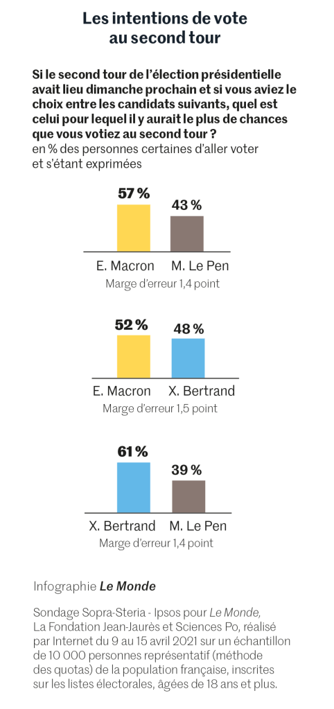 Sauf que la droite souffre encore d’un problème d’incarnation ; 21 % des sondés pensent que M. Bertrand ferait mieux qu’Emmanuel Macron (17 % pour Mme Pécresse, 10 % pour M. Retailleau, Marine Le Pen est à 28 %). L’espoir pour LR réside peut-être dans la volonté des électeurs de ne pas voir se reproduire un second tour similaire à celui de 2017, car la candidature de Xavier Bertrand semble, pour l’instant, plus solide face à l’extrême droite grâce à un meilleur report des voix.