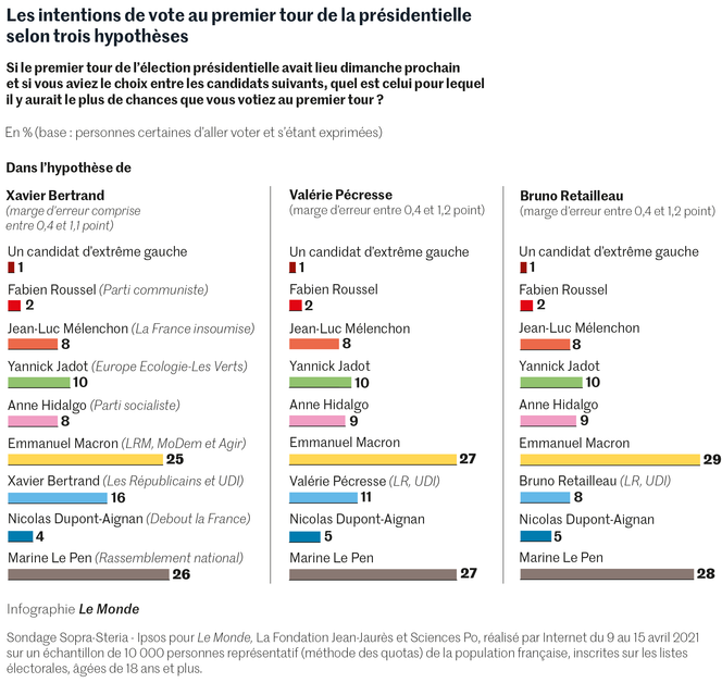 Alors que Xavier Bertrand a annoncé sa candidature le 24 mars en espérant provoquer un sursaut dans l’opinion et en balayant ses potentiels rivaux, la droite est toujours menacée d’être écartée dès le premier tour. Le président des Hauts-de-France est, en effet, jaugé à 16 %. Loin devant la présidente de l’Ile-de-France Valérie Pécresse (11 %) et Bruno Retailleau (8 %). Ces différentes enquêtes vont sans doute peser dans le débat interne au sein de LR, parti dont les statuts prévoient toujours l’organisation d’un scrutin pour départager les candidats. M. Bertrand essaie de l’esquiver en affirmant qu’il n’y participera pas et sera quoi qu’il arrive candidat.