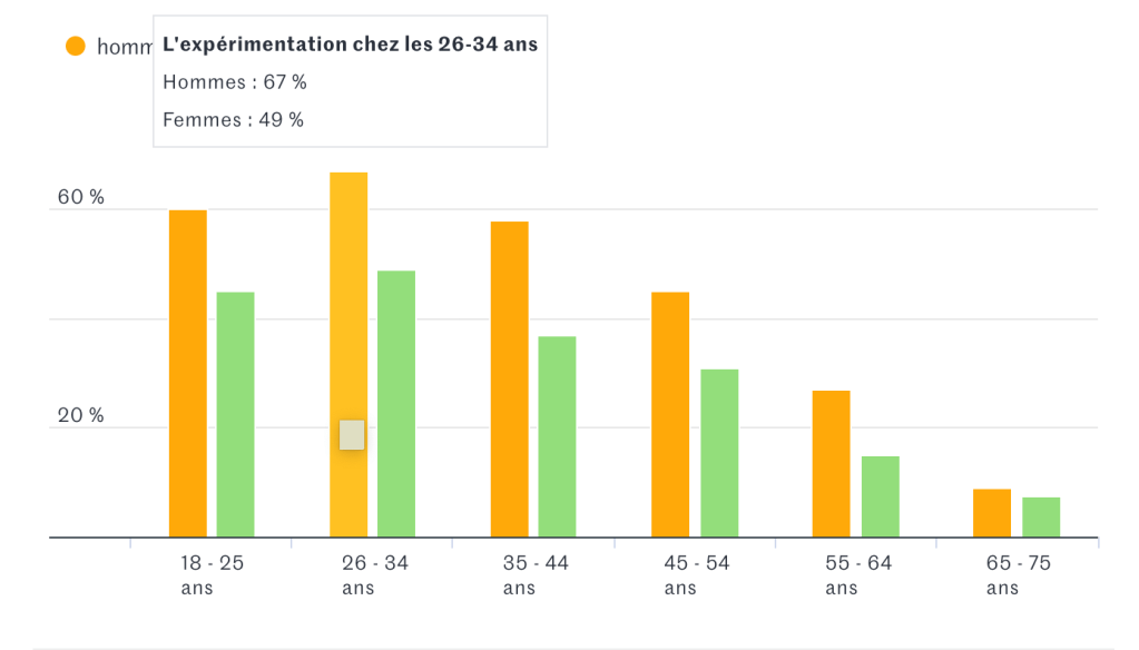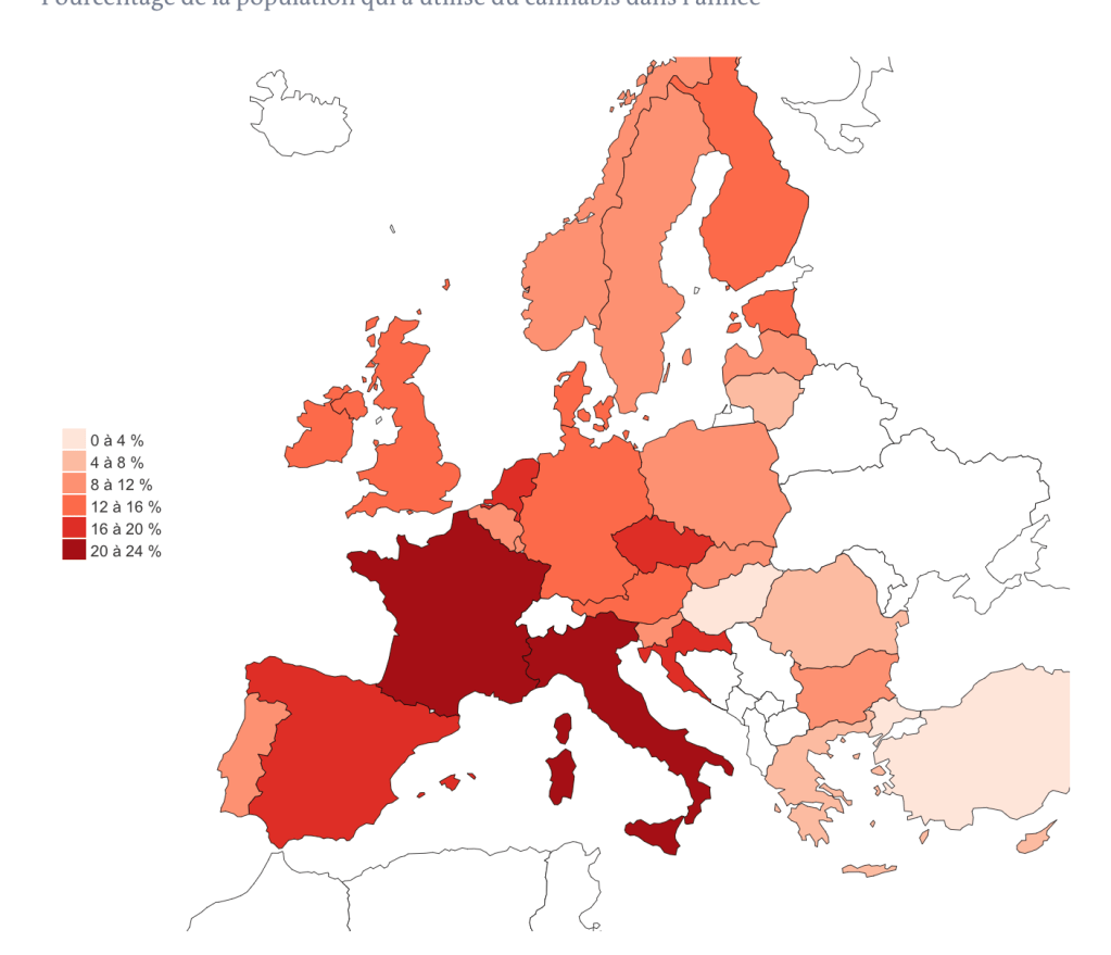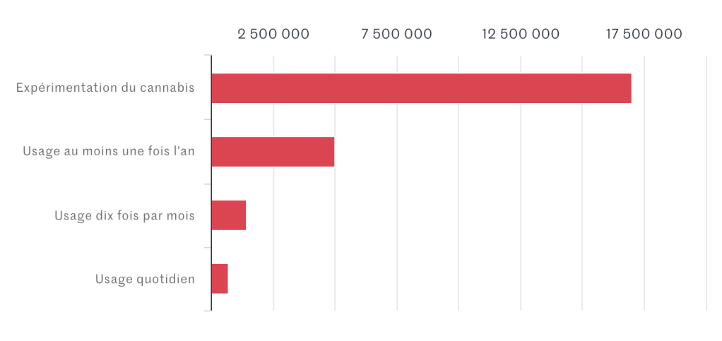 Selon une enquête de l’Observatoire français des drogues et des toxicomanies (OFDT) menée en 2016, on compterait dans la population âgée de 11 à 64 ans près de 17 millions de Français ayant expérimenté le cannabis. Parmi eux, 5 millions en ont consommé au moins une fois dans l’année, et 1,4 million ont fumé au moins dix fois dans le mois. Parmi eux, 700 000 déclarent avoir fait usage de cannabis de manière quotidienne.