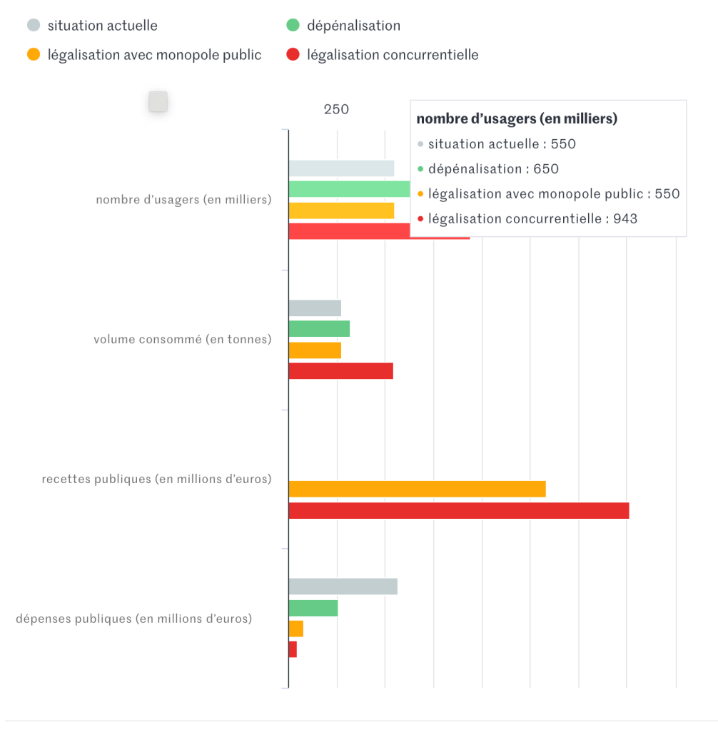 - la légalisation dans un cadre concurrentiel : avec un prix en baisse, les volumes de vente augmenteraient, et les recettes fiscales seraient plus élevées encore, autour de 1,7 milliard d’euros, pour un gain total de 2,2 milliards d’euros. Mais les économies sur la répression seraient contrebalancées par des dépenses accrues de prévention sanitaire, liées au grand nombre de consommateurs.