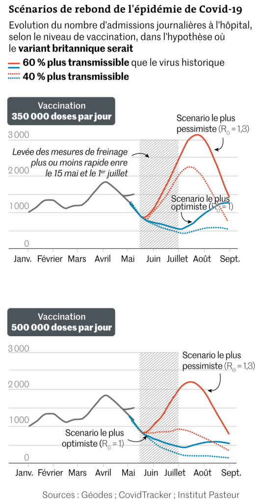 Les scientifiques ont établi différents scénarios de déconfinement d’ici le 1er juillet, en s’appuyant sur ce qui a été observé au cours de l’été 2020 (à ce moment-là, une grande partie des lieux publics avaient rouvert et les déplacements étaient libres). Selon eux, une quatrième vague pourrait s’amorcer dès le mois de juin, si la contagiosité du variant britannique – désormais dominant – reste 60 % supérieure à celle du variant historique. Sa hauteur pourrait même dépasser celle de la troisième vague si la vaccination n’accélère pas et se poursuit au rythme de 350 000 doses par jour.