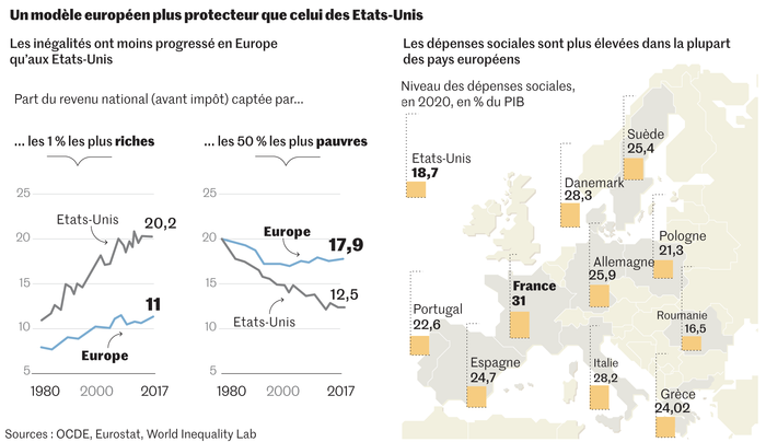 S’ajoute à cela les règles du pacte de stabilité limitant le déficit public à 3 % du PIB et la dette, à 60 % du PIB. Pour le moment suspendues, elles doivent revenir sur la table en 2022. « Si on ne les révise pas pour laisser une vraie place à l’investissement social dans les dépenses publiques, rien ne changera vraiment », prévient Pervenche Bérès, ancienne présidente de la commission des affaires économiques et monétaires au Parlement européen (2004-2009). « Le fiscal tient le social en l’état. »