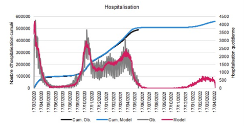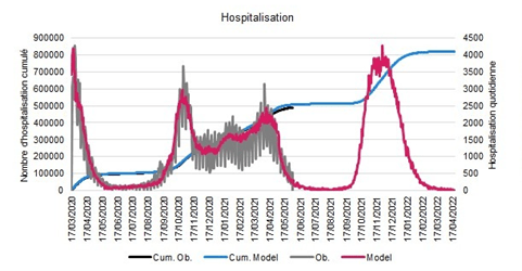 Figure 1: Illustration de la vague automnale 2021 avec un taux de vaccination de 75% dans la population vulnérable et 60% dans la population française totale (dernières estimations d’intentions vaccinales dans COVIPREV).