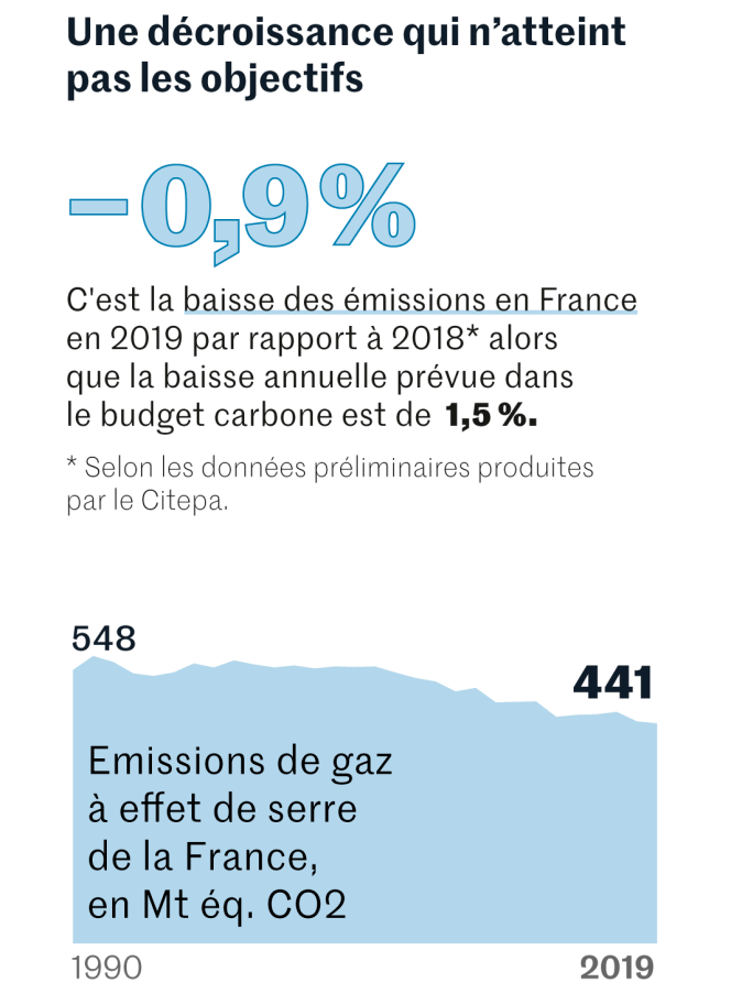Le rythme de baisse des émissions s’est légèrement accentué en 2019 (− 1,9 % sur un an), soit davantage que l’objectif fixé pour cette année-là. En 2020, les émissions auraient chuté de 9 %, selon des estimations préliminaires. Cette diminution inédite n’est cependant pas liée à des changements structurels, mais à la pandémie de Covid-19, qui a réduit l’activité économique, ainsi qu’à un hiver classé par Météo-France comme le plus chaud depuis 1900. Au niveau mondial, l’Agence internationale de l’énergie anticipe un rebond des émissions de 5 % en 2021.