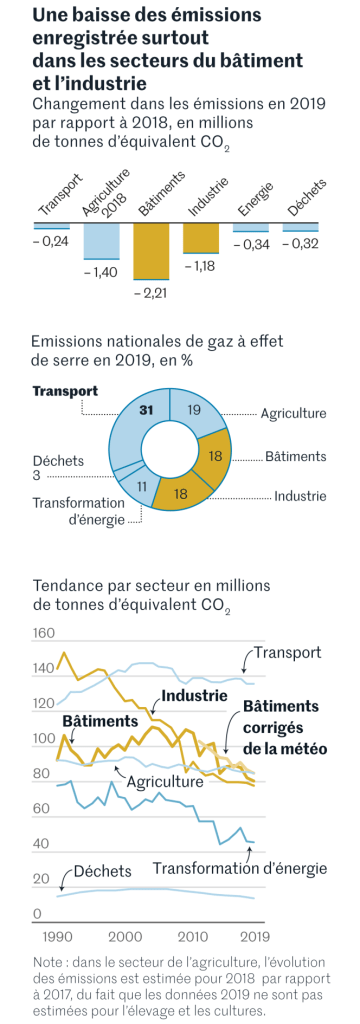 Les experts notent toutefois que des progrès, « dont certains d’ordre structurel », ont été effectués en 2019 dans les secteurs des bâtiments (notamment sous l’effet de la baisse de la consommation de fioul), de l’industrie (gains d’efficacité énergétique et décarbonation de l’énergie), de la transformation de l’énergie (substitution du gaz au charbon, développement des renouvelables) ainsi que de l’agriculture (baisse du cheptel bovin).
