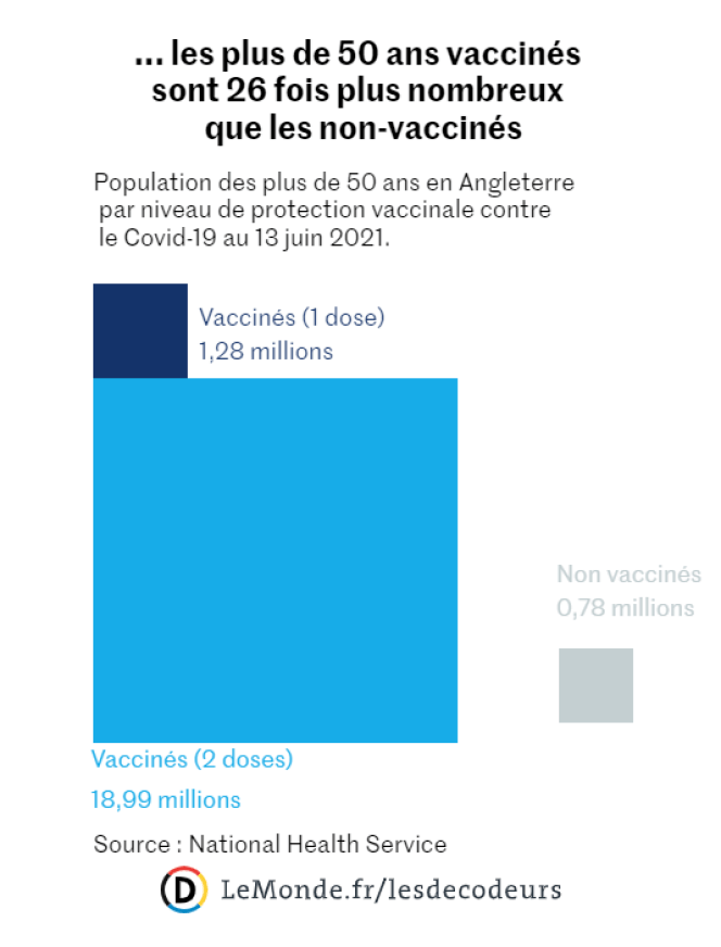 Au regard des chiffres de Public Health England, une personne non vaccinée âgée de 50 ans a en réalité presque vingt fois plus de chances de décéder du variant Delta qu’une personne qui est protégée par un vaccin anti-Covid-19. Ces chiffres sont cohérents avec les autres données du rapport (souvent passées sous silence par les militants antivaccin) : ils établissent (page 39) que la vaccination permet de réduire de 80 % (pour une dose) et de 96 % (pour deux doses) le risque d’être hospitalisé pour une forme grave de la maladie. Par ailleurs, parmi les personnes âgées de moins de 50 ans, huit sont mortes. Deux avaient reçu une première dose, six n’étaient pas vaccinées.