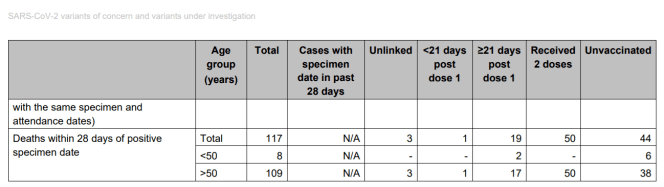Il est vrai que les données de ce rapport peuvent prêter à confusion : dans un tableau publié pages 13 et 14 et souvent cité hors de son contexte, on peut effectivement voir que le nombre de décès du variant Delta est plus élevé chez les personnes âgées de plus de 50 ans qui sont vaccinées que chez celles qui ne le sont pas.