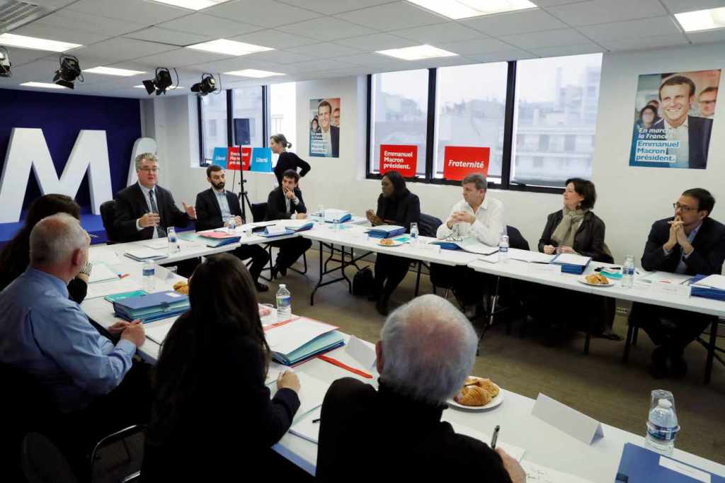 Cela fait des mois qu’Emmanuel Macron se prépare, dans le plus grand secret. Il réunit ses proches au cœur de l’hiver, à la veille d’un week-end, dans les appartements privés de Bercy. Autour de la table, une poignée de jeunes strauss-kahniens, Philippe Grangeon, ami de François Hollande, et l’écrivain François Sureau, proche de François Fillon. Adrien Taquet, le publicitaire de l’agence Jésus et Gabriel, présente au ministre des paperboards. Il propose un nom – En marche ! –, une typo, un logo. Pour le site Internet, il s’est inspiré de la marque américaine Apple, « centrée sur le produit ». Sa campagne marketing est guidée par trois principes : « Différenciation, désintermédiation, prise de risque. »