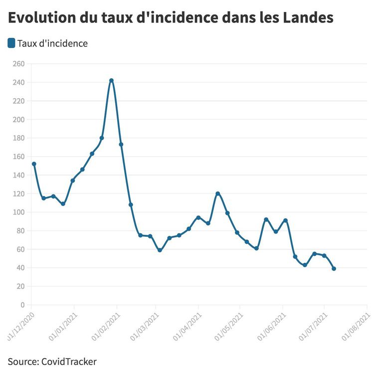 A l’inverse, les départements qui présentent un taux d’incidence bas, mais qui attirent de nombreux touristes l’été, comme c’est le cas des Landes – particulièrement touchées par le variant Delta – peuvent en réalité être le théâtre d’une circulation plus active du virus. La semaine dernière, le département a d’ailleurs levé les dernières restrictions du confinement, au vu d’une situation sanitaire « stable », tout en décidant de prolonger certaines mesures pour quinze jours. Les Landes avaient été le seul département à prolonger les dernières restrictions du confinement, maintenu en phase 3 jusqu’au 6 juillet à cause de la circulation du Delta. Aujourd’hui, il affiche un taux d’incidence à 39.