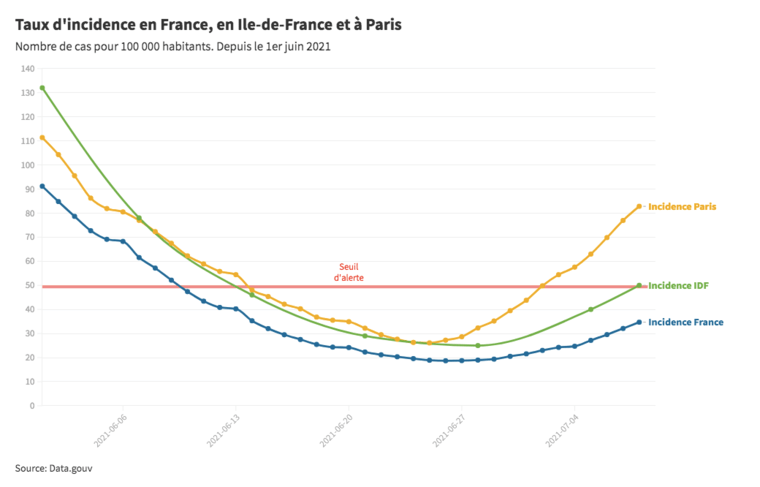 Avec la rapide progression du variant Delta en France, le virus circule davantage dans le pays. Sept départements affichent désormais un taux d’incidence supérieur à 50.