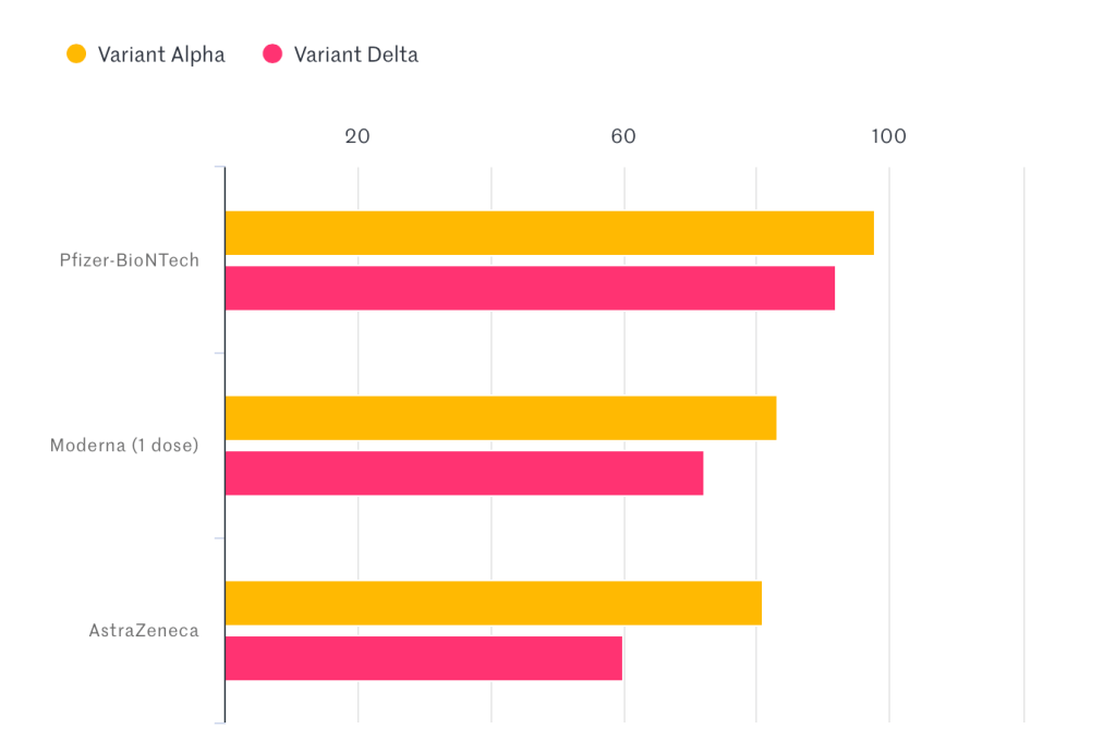 En mai 2021, des travaux britanniques ont estimé son efficacité à 88 % contre les infections symptomatiques au variant Delta. Le mois suivant, deux équipes ont abouti à des chiffres similaires : des chercheurs écossais ont estimé cette efficacité à 79 %, tandis qu’une équipe canadienne a trouvé environ 87 % d’efficacité.