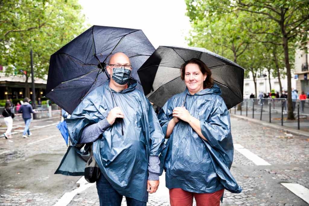 Bien couverts sous leurs capes de pluie, parapluies et double dose de vaccins, Michaël et Valérie Zwertvaegher lèvent les yeux au passage des avions de la patrouille de France. Eux non plus n’arrivent pas à comprendre que les anti fassent tant de bruit. L’un est masqué, l’autre pas. Mais tous deux sont des « vaccinés de la première heure » et espèrent ne pas l’avoir fait pour rien. « Si tout le monde ne s’y met pas, ça ne sert à rien. »
