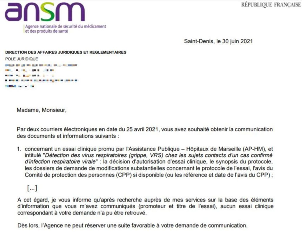 Victor Garcia observe que « saisi par un tiers, l’ANSM répond dans un mail […] « qu’aucun essai clinique correspondant à [cette] demande n’a pu être retrouvé ». […] Le CPP Sud Méditerranée 1 confirme ne « pas avoir donné d’avis favorable à la recherche mentionnée page 52 du document transmis ». En clair, cet essai impliquant des personnes humaines, dont des mineurs, n’a pas reçu d’autorisation légale ».