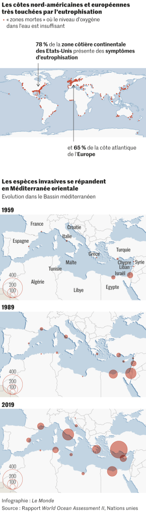 Faune, flore, composition chimique, altération des zones côtières, multiplication de pathogènes : depuis la publication, en janvier 2016, d’une première version de ce travail, l’ensemble des indicateurs a continué à se dégrader à de rares exceptions près. Il a fallu ajouter des chapitres pour tenir compte de menaces supplémentaires qui pèsent sur le monde marin : le bruit que les activités industrielles, pétrolières, gazières, les vaisseaux, les sonars envoient dans les colonnes d’eau ; l’érosion accélérée des côtes, les nouveaux polluants, la diffusion de substances médicamenteuses…