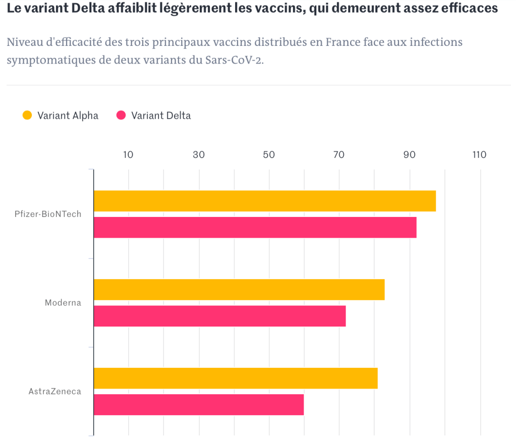Les données ont été collectées dans le cadre d’un essai clinique jusqu’à la mi-mars à un moment où le variant Alpha était majoritaire. La diminution d’efficacité pourrait être plus marquée avec d’autres variants. « On verra d’ici quelques mois ce qui passe avec Delta dans les autres pays doublement vaccinés », souligne le scientifique, selon qui il est malgré tout « certain » que l’efficacité du vaccin baisse avec le temps contre le variant Delta, bien plus contagieux que les lignées historiques.