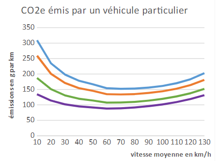 Ce rapport modélise des émissions « brutes » moyennes des véhicules, selon des cycles de conduite variés : phase de congestion avec des phases d’accélération et de décélération, à la fois en urbain, interurbain et autoroute. Les résultats présentés sur les courbes sont donc des émissions en fonction de valeurs moyennes de vitesses, dans des environnements et contextes très différents. Ces résultats ne sauraient être assimilés à des conditions de circulation à vitesse constante, ni à des conditions de circulation dans des zones à vitesses limites autorisées, notamment en agglomération (zone 30 par exemple).