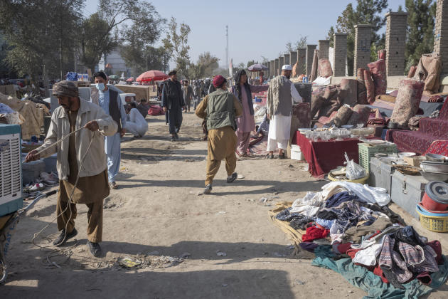 En périphérie de Kaboul, longeant un ancien terrain de foot transformé en terrain vague, au pied de la colline sur laquelle se dressent les ruines de Bala Hissar, l’ancienne forteresse historique de la capitale, un marché sauvage a fait surface. Il n’existait pas voilà trois semaines et il exprime à lui seul le désespoir d’une population. Des familles viennent y vendre, à perte, leurs biens pour survivre ou dans l’espoir de financer un très hypothétique départ à l’étranger – puisque les frontières leur sont fermées sans visa.