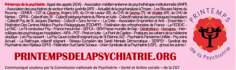 Pour cette raison, le Printemps de la psychiatrie prépare les Assises citoyennes du soin psychique les 11 et 12 mars 2022, autour des pratiques de soins que veulent les usagers, les familles et les professionnels de la psychiatrie et du médico-social, et y invite toutes les parties intéressées.