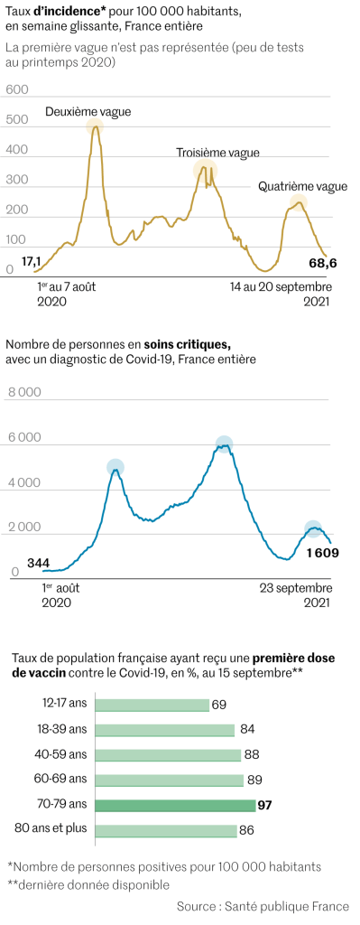 « Depuis cinq semaines d’affilée, l’incidence en métropole baisse à un rythme soutenu, de l’ordre de 25 % à 30 % par semaine », souligne Mahmoud Zureik, professeur d’épidémiologie et de santé publique à l’université de Versailles-Saint-Quentin. La semaine du 13 au 19 septembre, par exemple, le taux d’incidence a chuté de 27 %, le nombre de nouvelles hospitalisations pour Covid-19 de 28 % et celui des nouvelles admissions en soins critiques de 32 % par rapport à la semaine précédente, a révélé Santé publique France le 23 septembre. Cette même semaine, le nombre de décès liés à la pandémie a été de 501, contre 608 la précédente.
