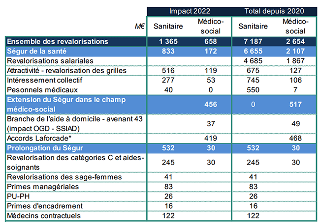 Plus de 2 Md€ supplémentaires sont consacrés en 2022 aux revalorisations du Ségur et aux mesures qui le prolongent et décidées depuis, « afin de promouvoir la transformation des métiers et la revalorisation de ceux qui soignent ». Ces dispositions s’ajoutent à l’ensemble des revalorisations dont ont déjà bénéficié les professionnels des établissements de santé et médico-sociaux en 2020 et 2021 (revalorisation socle de 183 € nets par mois, refonte des grilles, intéressement collectif…). Au total, ce sont près de 10 Md€ de hausses salariales des métiers de la santé et du médico-social qui auront été financées via l’ONDAM entre 2020 et 2022.