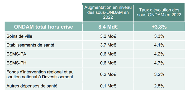 En 2021 les dépenses de l’assurance maladie, en prenant en compte la poursuite de la lutte contre la COVID-19, le déploiement des mesures du Ségur de la santé et de l’avenant numéro 9 à la convention médicale (dont les montants sont sans commune mesure !), sont estimées à 237,1 Md€, soit une évolution à champ constant de +7,4 % par rapport à l’ONDAM (Objectif national des dépenses d’assurance maladie) rectifié de 2020. Mais cette année l’ONDAM est encore plus difficile à appréhender qu’avant la crise. Ainsi, s’il continuera à progresser fortement en 2022 (+3,8 % hors dépenses liées à la crise sanitaire et +2,6 % hors celles liées au Ségur de la santé), du fait de la baisse des frais en lien avec l’épidémie (5 Md€ de provisionnés pour 2022 contre près de 15 Md€ prévus en 2021), sur l’ensemble du périmètre, l’évolution serait de -0,6 % par rapport à l’ONDAM rectifié de 2021.