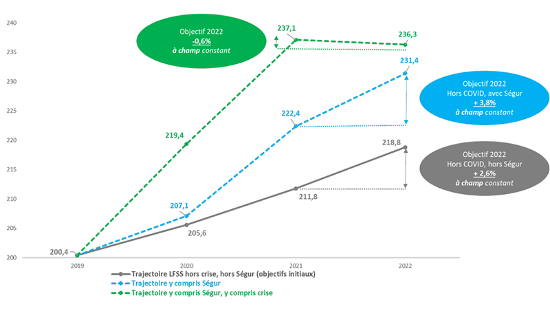 Figure 2. Évolution de l’ONDAM 2020-2022 compte tenu de la crise et des mesures Ségur