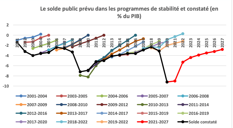 Dans ces conditions, la trajectoire de baisse du déficit public, jusqu’à 2,8 % du PIB en 2027, ne sera pas respectée, comme les trajectoires de presque tous les programmes de stabilité depuis le début des années 2000.