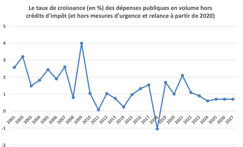Hors mesures d’urgence et de relance, la croissance en volume des dépenses publiques (hors crédits d’impôts) a été de 1,3 % en 2020 et serait de 2,1 % en 2021, de 1,1 % en 2022, puis de 0,7 % en moyenne annuelle sur la période 2023-2027, soit 1,0 % en moyenne sur l’ensemble des années 2021-2027. Or elle a été de 2,1 % en moyenne annuelle dans les années 2001 à 2008 puis ramenée à 0,8 % en moyenne annuelle dans les années 2012 à 2019.