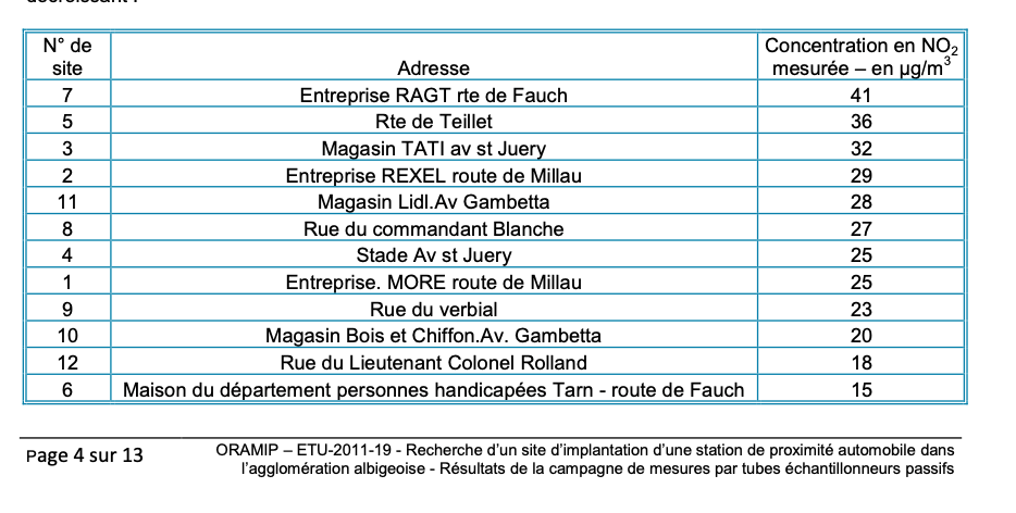 Cette étude est introuvable sur internet: « Recherche d’un site d’implantation d’une station de proximité automobile dans l’agglomération albigeoise Résultats de la campagne de mesures par tubes échantillonneurs passifs. » A noter que le site de la route de Saint-Juery donnait un taux un peu élevé, alors que la rocade est en contrebas et donc la réalité de la pollution étant sous estimé, il n’a pas été retenu ! On comprend pourquoi Madame Guiraud Chaumeil a tout fait avec le promoteur des terrains de l’Hôpital à la Renaudié pour qu’il n’y est pas d’étude d’impact comportant une analyse de la pollution de l’air et du bruit, vu la proximité d’une école et d’un EHPAD (MAPAD de la Renaudié).