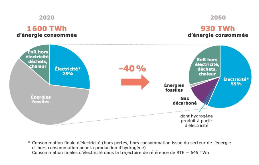 Mais cela nécessitera également une électrification importante des usages. Aujourd’hui, 63 % de l’énergie consommée en France est encore issue de combustibles fossiles, synonyme d’émission de CO2. Pour éliminer, à terme, le pétrole et le gaz, il faudra remplacer les véhicules thermiques par des électriques, les hauts fourneaux utilisés dans la sidérurgie par des fours électriques, le chauffage au fioul par des pompes à chaleur là encore électriques… Résultat, l’électricité deviendrait la source d’énergie majoritaire en 2050 et représenterait 55 % du mix énergétique (contre 25 % aujourd’hui).