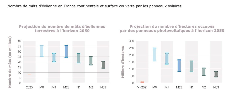 S’il peut poser des difficultés d’acceptabilité sociale ou d’intégration dans le cadre de vie, le développement de l’éolien terrestre et du solaire ne conduira pas à une forte artificialisation et imperméabilisation des sols, assure RTE. A l’échelle du territoire, les surfaces consacrées au système électrique resteront faibles (entre 20 000 et 30 000 hectares sur 55 millions) : la France compterait entre 25 000 et 35 000 éoliennes en 2050 dans un scénario « 100 % renouvelables » (à titre de comparaison, l’Allemagne en compte 30 000 aujourd’hui sur un territoire moins grand) et les panneaux solaires pourraient couvrir entre 0,1 et 0,3 % du pays.