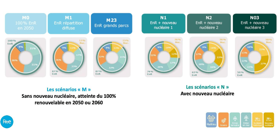 Les trois options « N » prévoient la mise en service de huit à quatorze EPR2 (réacteurs pressurisés européens de deuxième génération) et d’aucun à « plusieurs » petits réacteurs modulaires (SMR) entre 2035 et 2050. Dans le scénario N03, qui donne le plus de place à l’énergie nucléaire, RTE préconise l’installation de 27 gigawatts (GW) de nouveaux réacteurs nucléaires (dont 4 GW de SMR) d’ici à 2050. Cela nécessite le « lancement d’un programme plus rapide de construction de nouveaux réacteurs », soit une paire tous les trois ans dès 2035. De plus, « cela implique d’exploiter le plus longtemps possible le parc nucléaire existant », prolongeant son exploitation jusqu’à soixante ans, écrit RTE. Dans ce contexte, les énergies renouvelables pèsent 70 GW, pour le solaire photovoltaïque, 40 GW pour l’éolien terrestre et 22 GW pour l’éolien en mer.