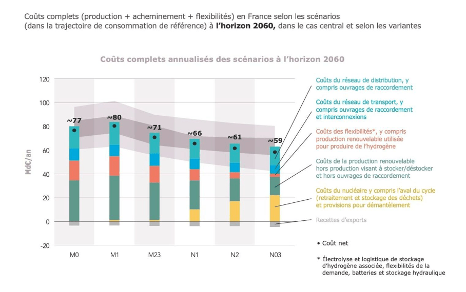 Un mix intégrant une très forte part d’énergies renouvelables nécessite de déployer des flexibilités importantes (interconnexions, stockage hydraulique, batterie, et centrales thermiques à hydrogène, pilotage de la demande). Une fois ces coûts intégrés, les scénarios avec du nouveau nucléaire sont plus compétitifs, y compris, et c’est un élément majeur du débat, si les coûts des EPR de deuxième génération restaient voisins de ceux de l’EPR de Flamanville. RTE conclut de façon très clair que construire de nouveaux réacteurs est la solution la plus pertinente au niveau économique et que la prolongation au moins jusqu’à 60 ans de certains ancien réacteurs est ce qui permettra à la France d’être en ligne avec les objectifs climatiques.