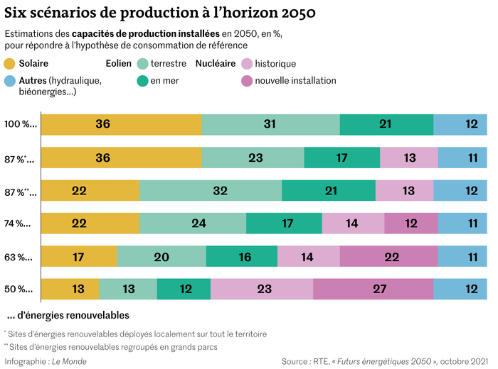 Pour la future production électrique du pays, les diverses trajectoires vont d’une option « 100 % d’énergies renouvelables » à une autre avec encore 50 % de nucléaire. A chaque fois, la société RTE, détenue majoritairement par EDF et la Caisse des dépôts, décrit les conditions de faisabilité technique, mais aussi le coût et l’impact attendu pour l’environnement et pour la société. Outre ce premier rapport de quelque 600 pages, le résultat complet des modélisations devrait être rendu public début 2022.