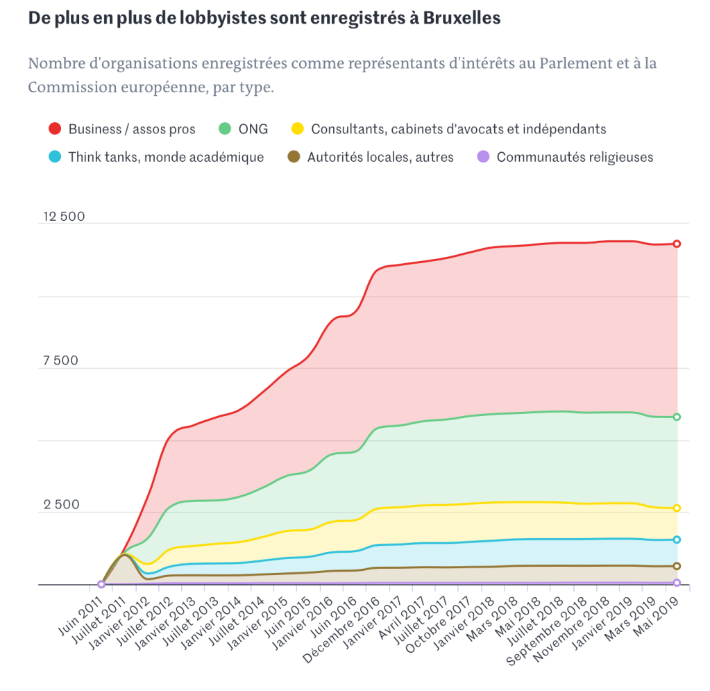 Le registre commun à la Commission et au Parlement compte à ce jour environ 11 800 organisations déclarées comme représentantes d’intérêts auprès des décideurs et fonctionnaires de l’Union européenne (UE). Le nombre d’équivalents temps plein déclarés par celles-ci est de 24 894. L’Organisation non gouvernementale Transparency International estime quant à elle à environ 26 500 le nombre de lobbyistes présents de façon régulière à Bruxelles, et à environ 37 300 le nombre de personnes impliquées dans les activités de lobbying dans la capitale belge. Cette dernière concentre ainsi le deuxième plus gros bataillon de lobbyistes du monde, après la capitale fédérale américaine, Washington, DC.