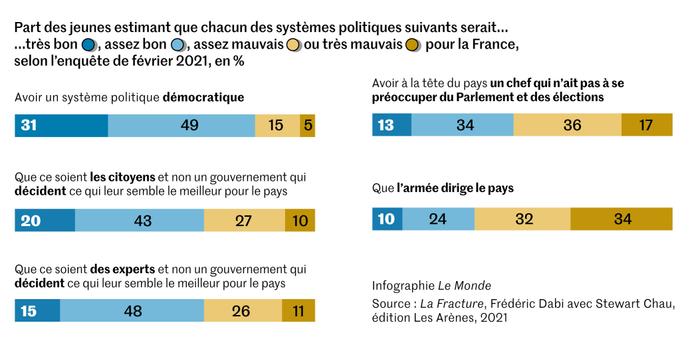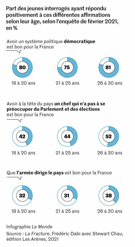 Autre évolution surprenante : la demande d’autorité. Cette notion fait pleinement partie « de l’univers de représentations des 18-30 ans ». Pour M. Dabi, « c’est une rupture claire avec les générations passées, tant le rejet de l’autorité, qu’il soit réel dans son quotidien ou fantasmé, faisait partie, dans les années 1960, 1970 ou 1980, de l’imaginaire de la jeunesse et constituait un ingrédient essentiel de son opposition au monde adulte ». Ainsi, ils sont 34 % à approuver l’idée que « l’armée dirige le pays », et 47 % (dont la majorité des 25-30 ans) jugent positif « d’avoir à la tête du pays un chef qui n’a pas à se préoccuper du Parlement et des élections ». Il ne faut pas occulter, pour autant, que 80 % d’entre eux estiment que la démocratie est un bon système politique.