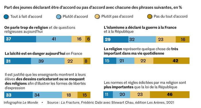 Se fondant sur les résultats de précédentes enquêtes de l’IFOP pour Marianne(en 2020) et une autre pour le Comité Laïcité République, Frédéric Dabi estime que la jeunesse « fait bande à part » sur les questions de discriminations et de laïcité. Il développe : « Quel que soit le thème retenu, de la lutte contre le racisme à celle contre les discriminations ethniques dans l’accès à l’emploi ou au logement, en passant par la lutte contre les actes antimusulmans ou celle contre les inégalités sociales, les 18-30 ans ressentent une situation hexagonale systématiquement et majoritairement insatisfaisante. » Mais le fossé le plus béant concerne la laïcité. Ainsi, la part des moins de 30 ans appréhendant la laïcité comme un objet positif est inférieure de 20 points à celle mesurée auprès du grand public (79 % contre 99 %).