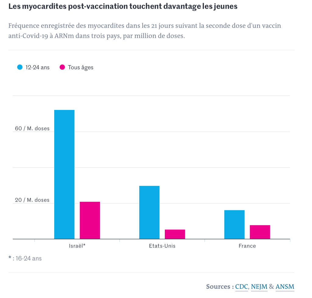 Un effet indésirable rare mais documenté des vaccins à ARN messager (ARNm) est néanmoins très surveillé : la myocardite. Cette inflammation touchant le cœur provoque souvent des douleurs thoraciques faibles à modérées, mais est parfois asymptomatique. Les cas de complications sont rares, mais existent : en Israël, un cas fatal a été recensé sur les 5,1 millions de personnes immunisées avec le vaccin de Pfizer-BioNTech. « Les mécanismes [à l’origine de ces myocardites] ne sont pas connus, explique Mahmoud Zureik. Mais ce n’est pas un risque anodin : une myocardite, c’est une hospitalisation, même si l’issue est très souvent favorable. »Aux Etats-Unis, une équipe de chercheurs de l’université de Californie (dans une prépublication pas encore relue par les pairs) rapporte en effet que 86 % des jeunes garçons ayant contracté une myocardite ont été hospitalisés.