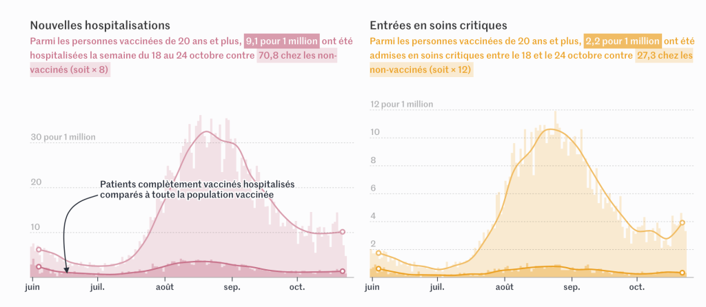 L’efficacité de la couverture vaccinale est telle que, malgré l’écart de plus de 38 millions de personnes entre la population vaccinée et celle qui ne l’est pas, en valeur absolue les personnes non vaccinées demeurent majoritaires dans les entrées à l’hôpital.