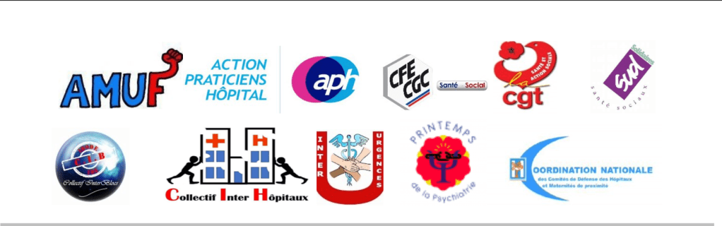 *CGT, Amuf, APH, CFE-CGC, SUD, les collectifs Inter-bloc, inter-hôpitaux et inter-Urgences, le Printemps de la psychiatrie et la Coordination nationale des comités de défense des hôpitaux et des maternités de proximité