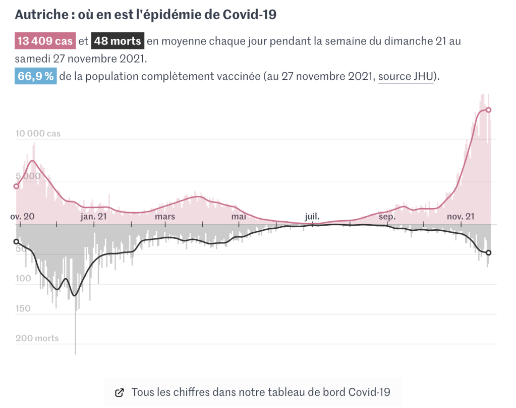 Dans le Land de Salzbourg, par exemple, le taux d’incidence moyen sur les sept derniers jours a dépassé les 1 700 cas pour 100 000 habitants.