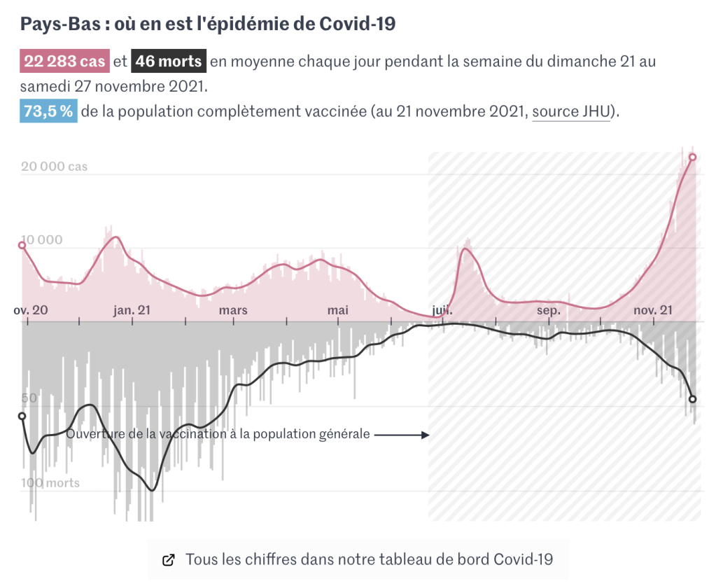 En Europe du Nord, seule la Suède s’en sort bien. En Belgique, aux Pays-Bas, au Danemark, en Allemagne, en Irlande…, le redémarrage de l’épidémie a été très brutal. Cette situation « préoccupante », selon l’ECDC, touche aussi l’Autriche, la Finlande, l’Islande, le Luxembourg, la Norvège. La Belgique, les Pays-Bas et la France ont des couvertures vaccinales très proches : respectivement, 75 %, 76 % et 76 % de leurs habitants y avaient reçu une première dose de vaccin au 14 novembre. Mais les deux premiers, malgré une couverture vaccinale élevée, ont vu une nouvelle vague déferler quand ils ont percé la digue des mesures barrières, à la fin de l’été.
