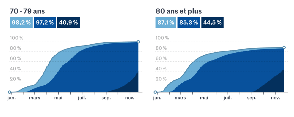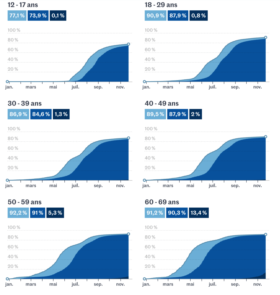Ce graphique présente l’évolution cumulée de la vaccination par tranche d’âge en France, que ce soit une première injection, une vaccination complète ou une dose de rappel au 23 novembre 2021.