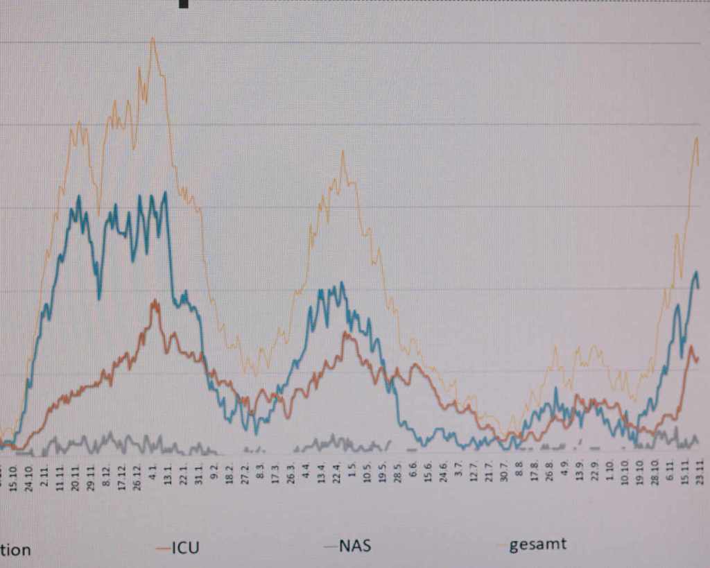 Imposée par les circonstances, l’étrange torpeur qui semble avoir saisi l’hôpital de Munich n’est qu’apparente. Fermé aux visiteurs, l’établissement croule sous les malades. Vendredi 26 novembre, le nombre de ceux qui y étaient hospitalisés des suites du Covid-19 était de 65. Parmi eux, vingt-quatre se trouvaient en soins intensifs, soit quatre fois plus qu’à la mi-octobre. Des chiffres qui, à première vue, sont encore loin de ceux de la fin décembre 2020, au sommet de la deuxième vague : à l’époque, l’établissement munichois avait accueilli 102 malades du Covid-19, dont 86 en soins intensifs.